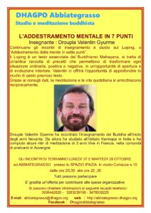 Siamo felici di comunicare che Droupla Valentin Gyurme guiderà due serate di insegnamenti sull’Addestramento mentale in 7 punti del Lojong. Gli incontri si terranno lunedì 27 e martedì 28 ottobre 2025 alle ore 20.30 ad Abbiategrasso (MI), presso lo Spazio Ipazia di Vicolo Cortazza 10. L’ingresso è aperto a tutti. Per maggiori informazioni vi invitiamo a cliccare sulla locandina.